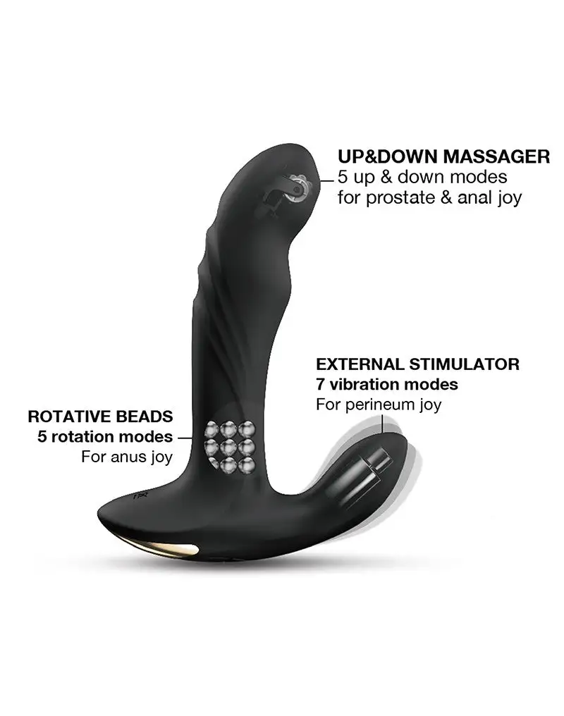 Multi P-Joy is een echte innovatie in mannelijk genot. De eerste motor met massageballetjes bevindt zich in de flexibele kop van de vibrator, die dankzij de golvende schacht op en neer beweegt om de prostaat met de grootste precisie te stimuleren. De tweede motor heeft draaiende balletjes om de anale wand te stimuleren. De derde motor gericht is op het perineum genot. Dankzij de ronde vorm is een gemakkelijke en zachte penetratie gegarandeerd. De prostaat stimulator heeft 5 op-en-neer modi, 5 rotatie modi en 7 vibratie modi.