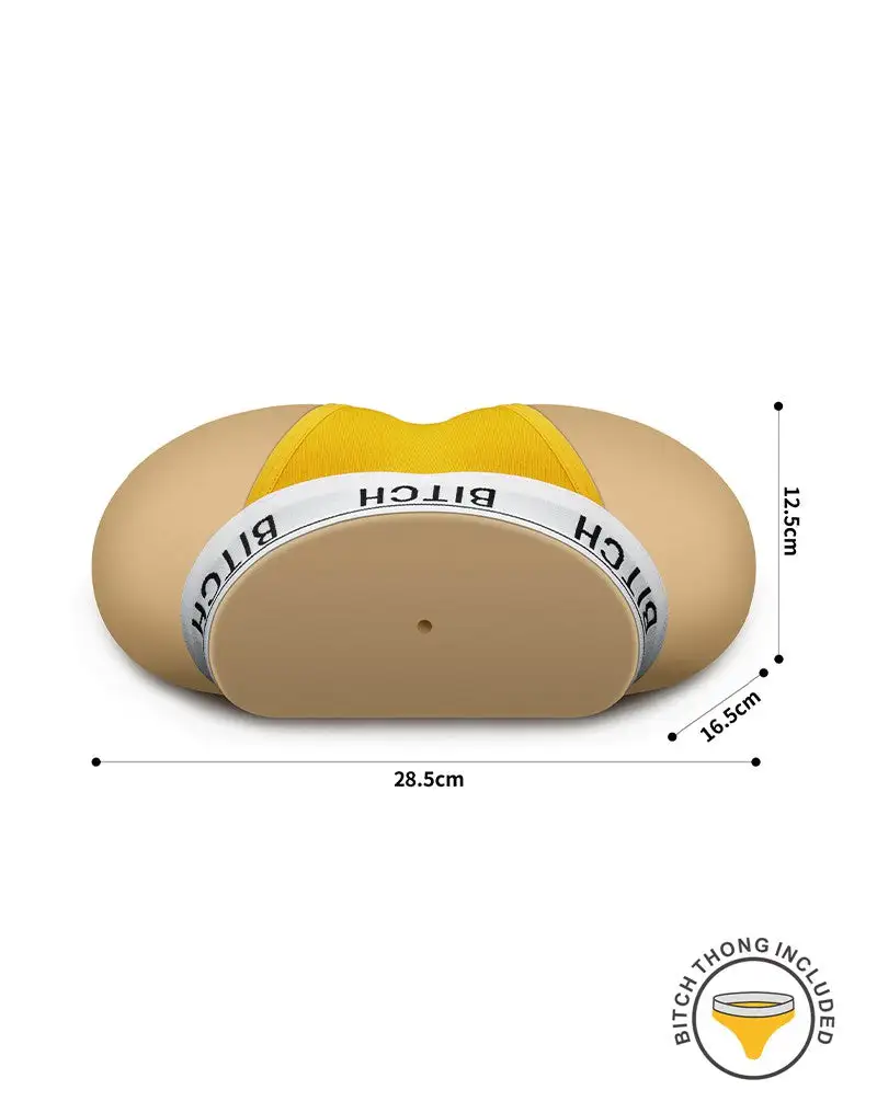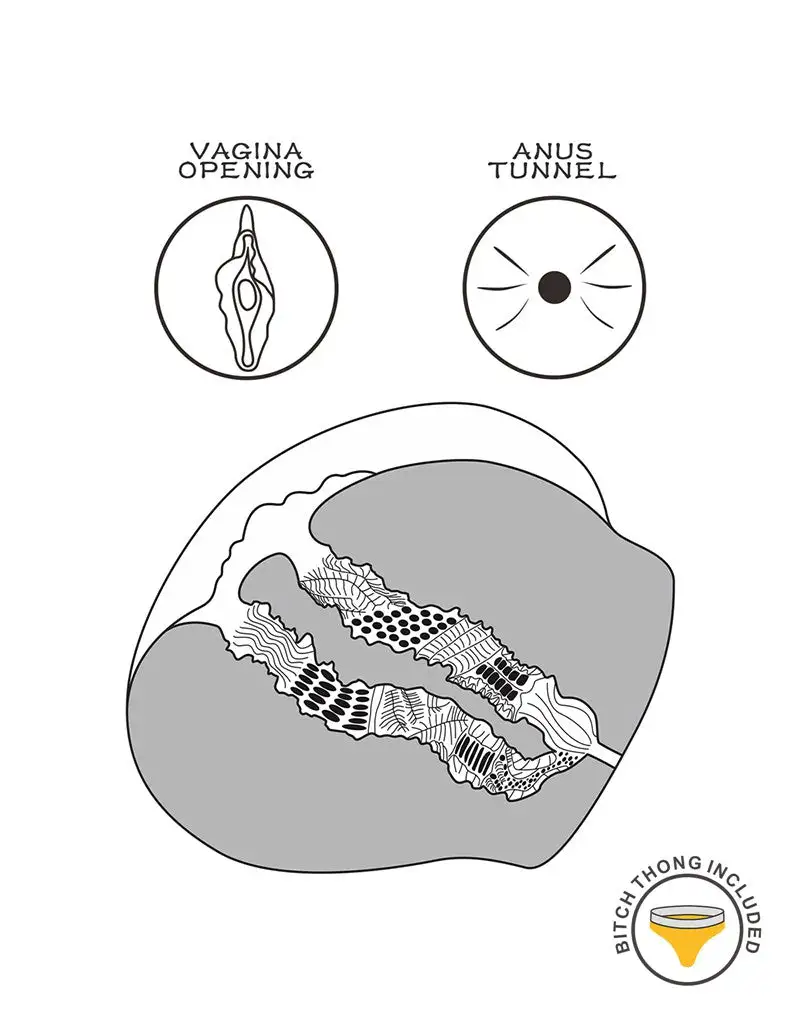 Deze masturbator is gemaakt van realistisch, huidvriendelijk materiaal dat het vrouwelijk lichaam nabootst en zorgt voor een uiterst realistische ervaring. De ontworpen vaginale tunnel heeft getextureerde binnenkant dat duidelijk voelbaar is bij het inbrengen van de penis. Inbegrepen is een gele “bitch”-string. De string kan ook van de masturbator worden verwijderd.